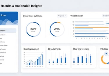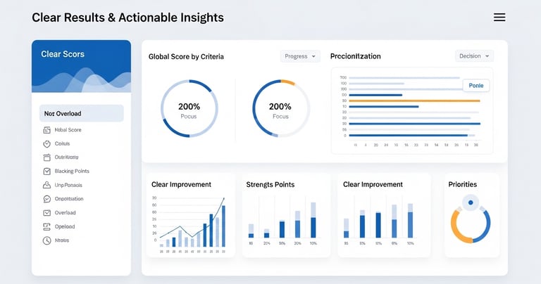 Score global par critère - Forces & points bloquants - Problèmes de compréhension ou de confiance - Suggestions d’amélioration prioritaires