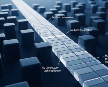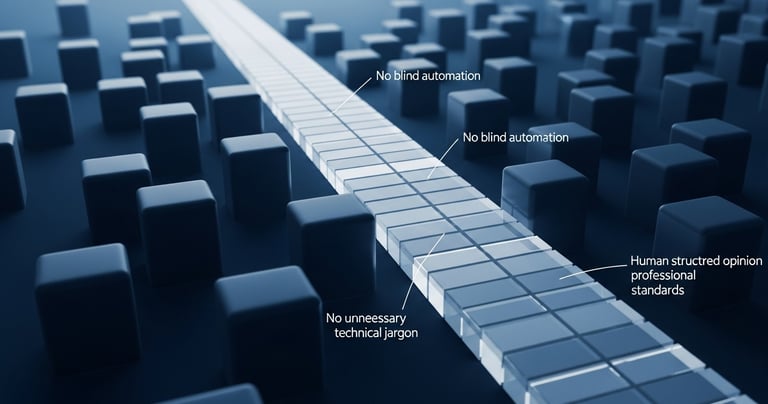 Pas d’automatisation aveugle - Pas de jargon technique inutile - Une opinion humaine structurée - Basé sur des standards utilisés par les grandes plateformes